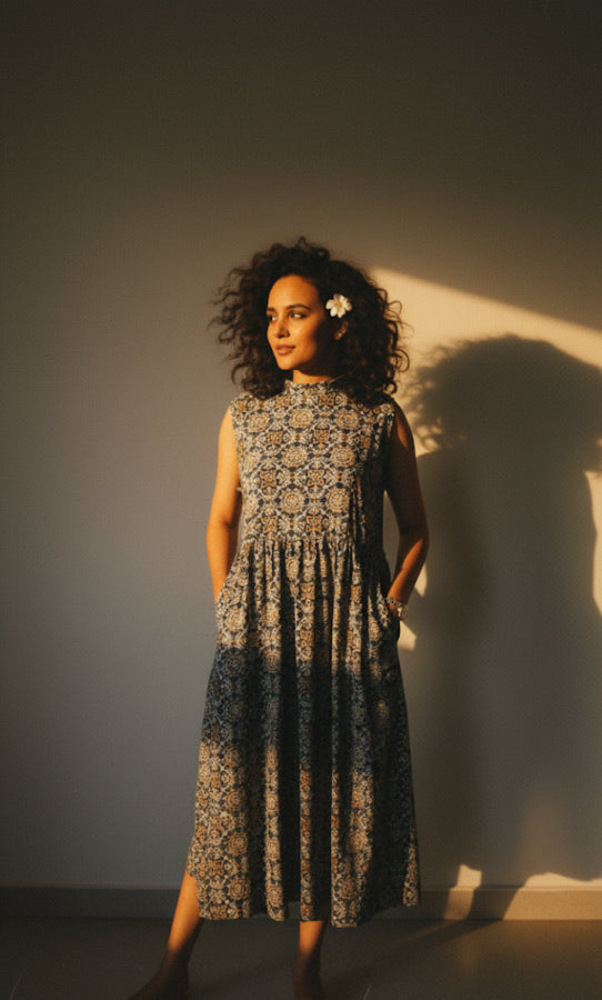 Elevate your everyday look with this Cotton Ajrakh Print Midi Dress. Crafted from 100% breathable cotton, it showcases traditional Ajrakh block prints in rich earthy tones. The sleeveless cut and gathered waist offer a relaxed yet flattering fit, while practical side pockets make it as functional as it is beautiful. Perfect for warm days, brunches, or casual gatherings.