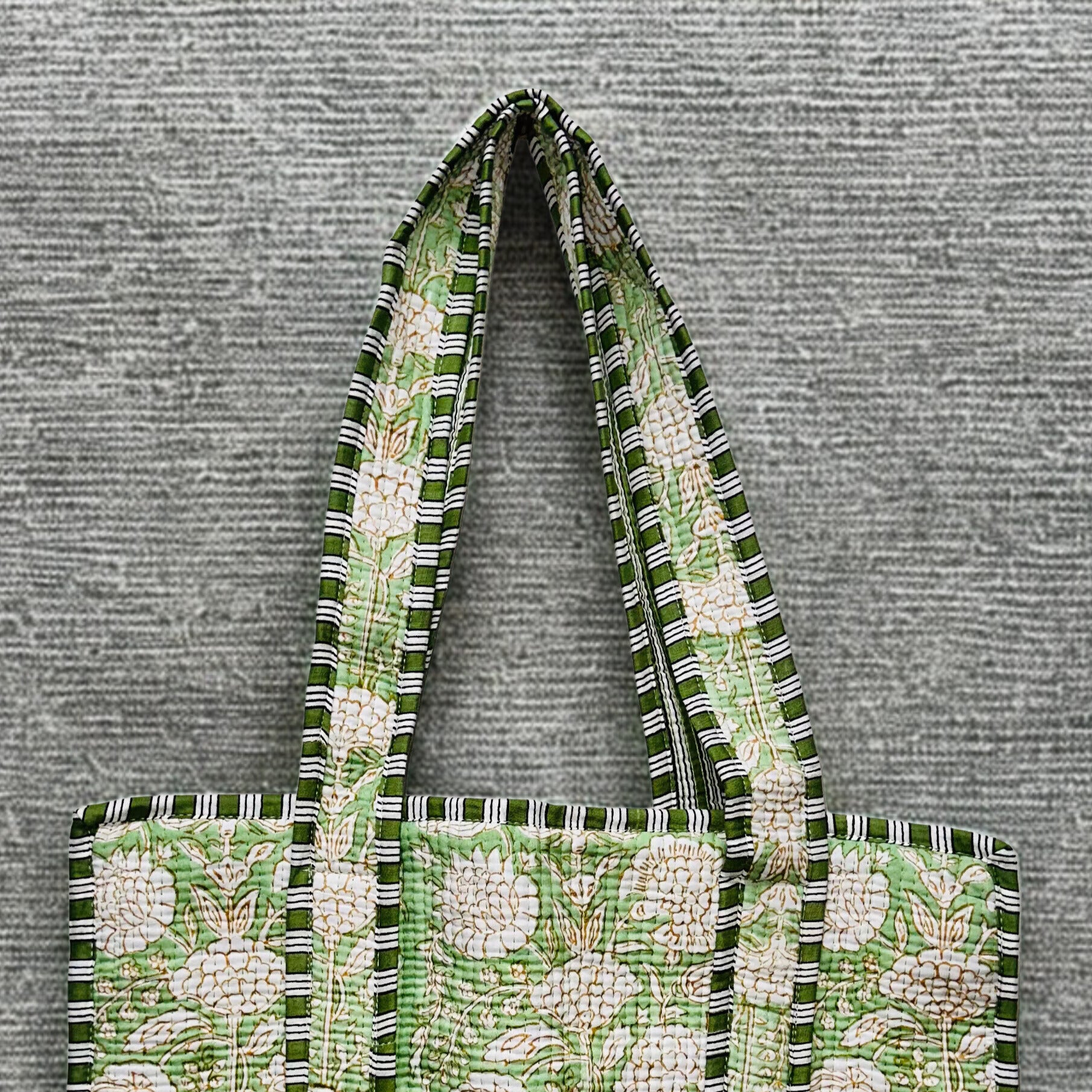 This hand-printed tote bag features a timeless green and white floral pattern, combining artisan craftsmanship with practical design. Crafted with attention to detail, it includes a secure zipper closure to keep your belongings safe. Its spacious interior and durable construction make it ideal for daily use, offering both style and functionality for those who appreciate unique, handcrafted accessories.