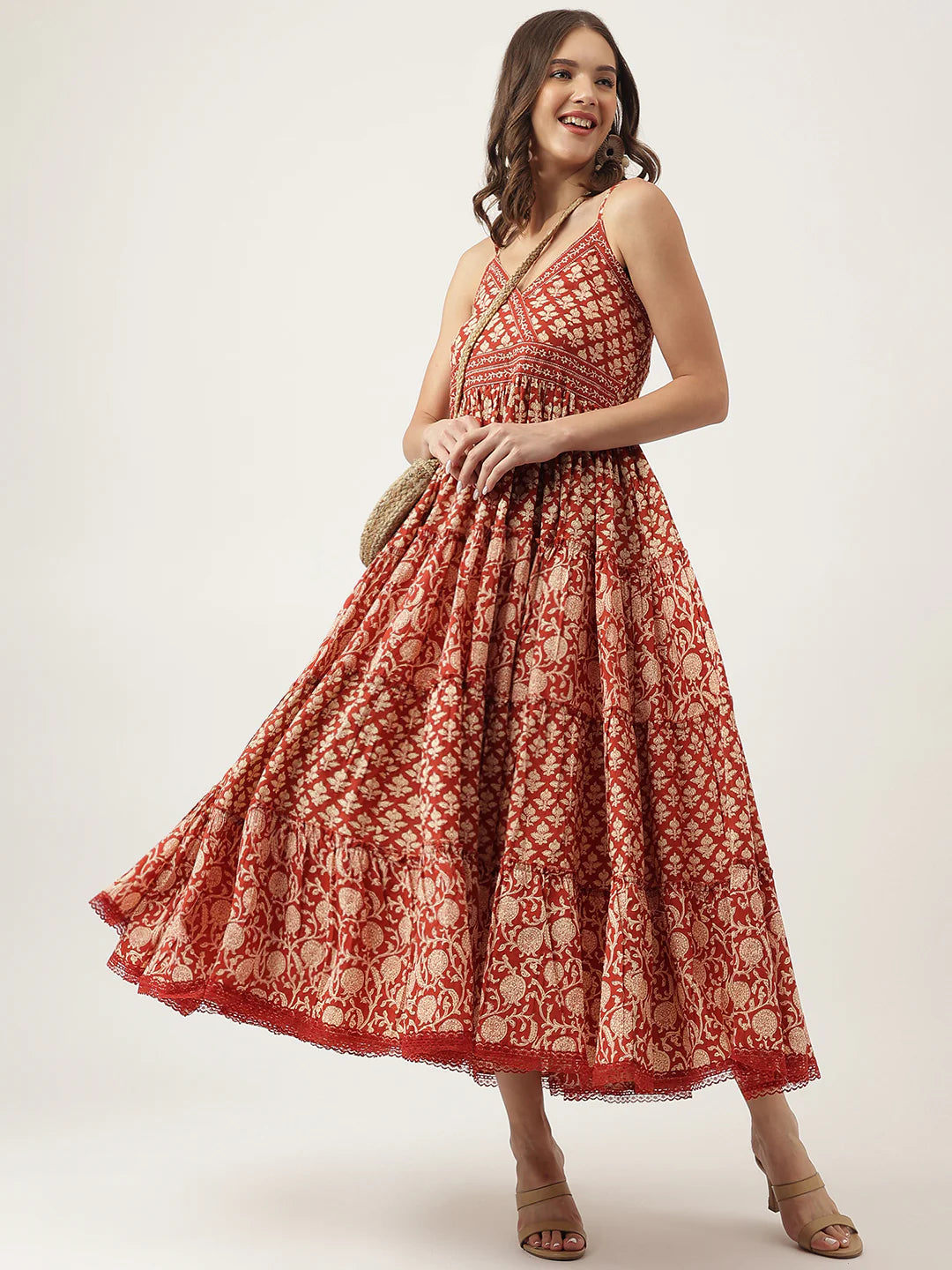 Add a touch of boho charm to your wardrobe with this Maroon Floral Printed Cotton Tiered Dress with Smocking Back. Crafted from soft, breathable cotton, this dress features a flattering tiered silhouette that flows effortlessly with every step. The all-over floral print brings a romantic, vintage-inspired feel, while the smocked back offers added stretch and comfort. Whether you're headed to a picnic, weekend outing, or casual lunch, this dress combines comfort with effortless style.