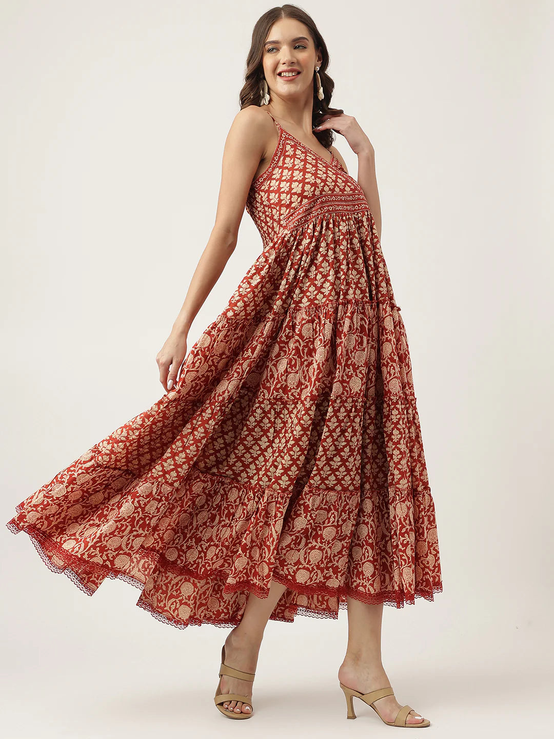 Maroon Floral printed Cotton Tiered Dress with Smoking Back