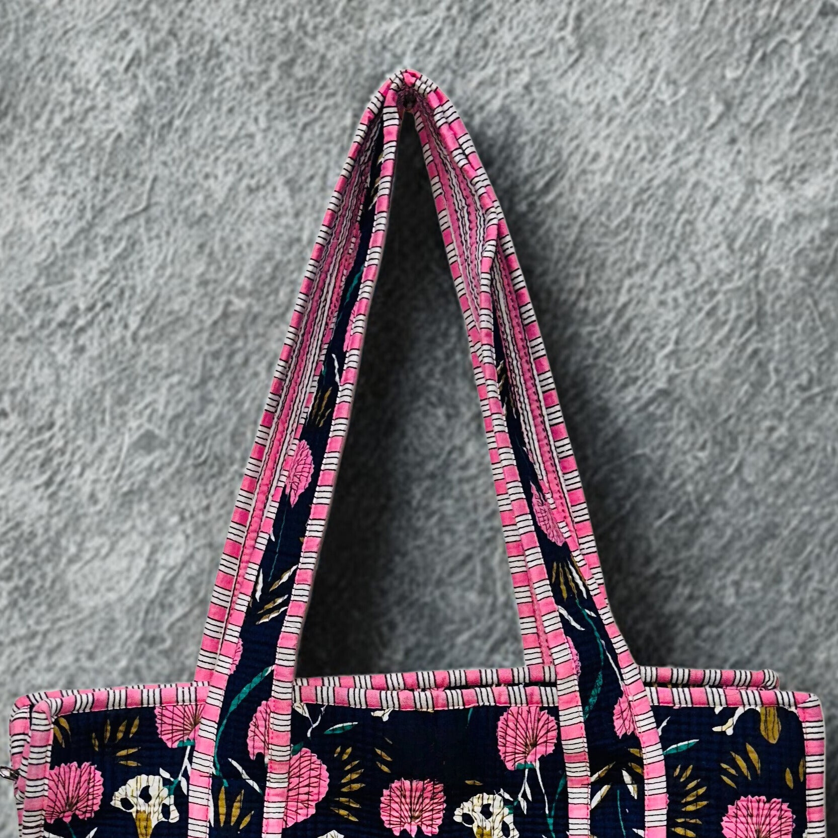 Elevate your everyday carry with these Pink Floral Hand-Printed Tote Bags featuring a secure zipper closure. Crafted with meticulous hand-printed floral designs, each bag offers a unique aesthetic combined with practical functionality. The zipper ensures your belongings stay safe, while the spacious interior accommodates essentials with ease, making it an expert choice for stylish organisation on the go.