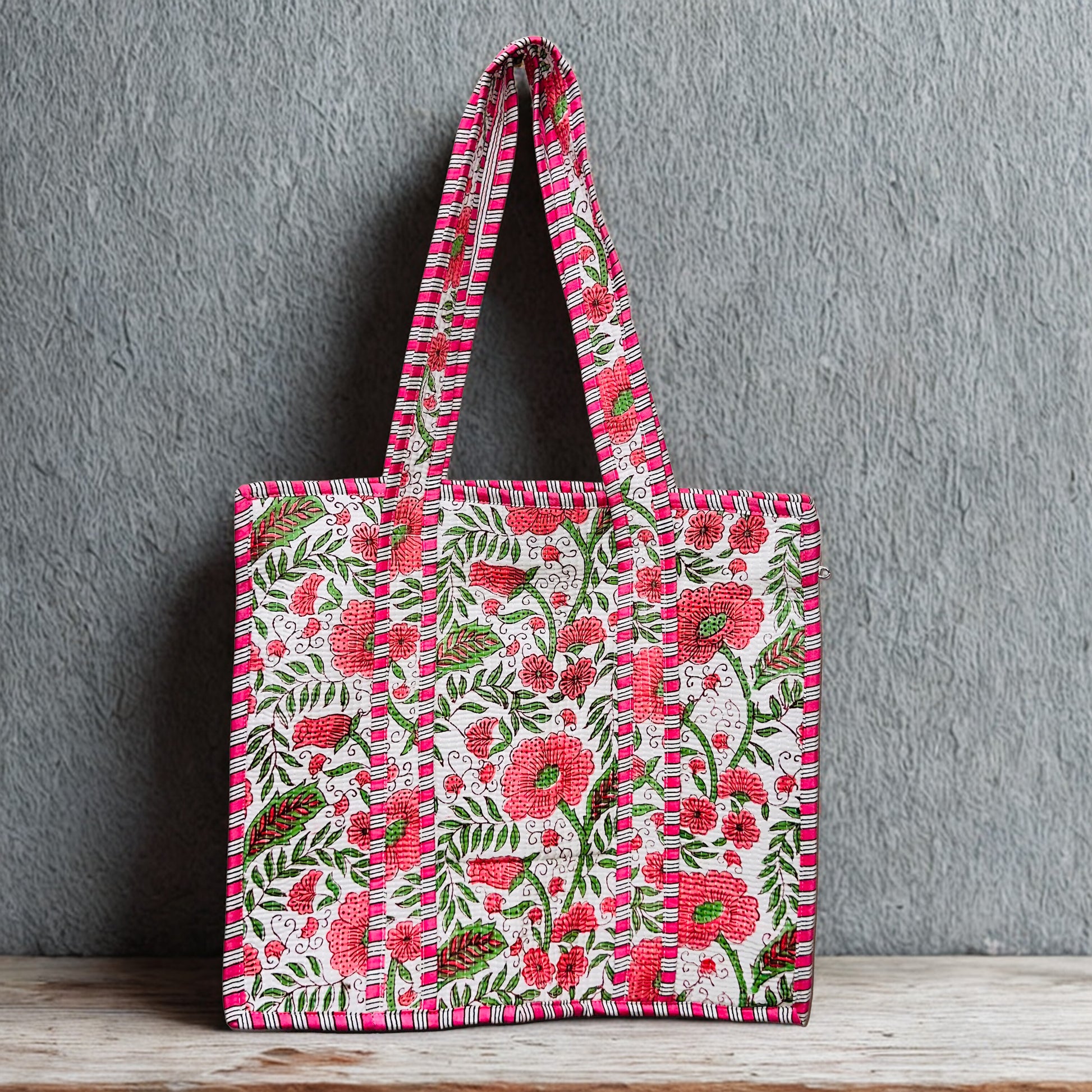 Elevate your daily carry with these Pink Floral Hand-Printed Tote Bags featuring a secure zipper closure. Expertly crafted, each bag showcases detailed floral designs that highlight artisanal hand-printing techniques. The zipper ensures belongings stay safely contained, making it ideal for everyday use. Combining style with functionality, this tote offers durable construction and a spacious interior, perfect for those who value both aesthetic appeal and practicality in their accessories.