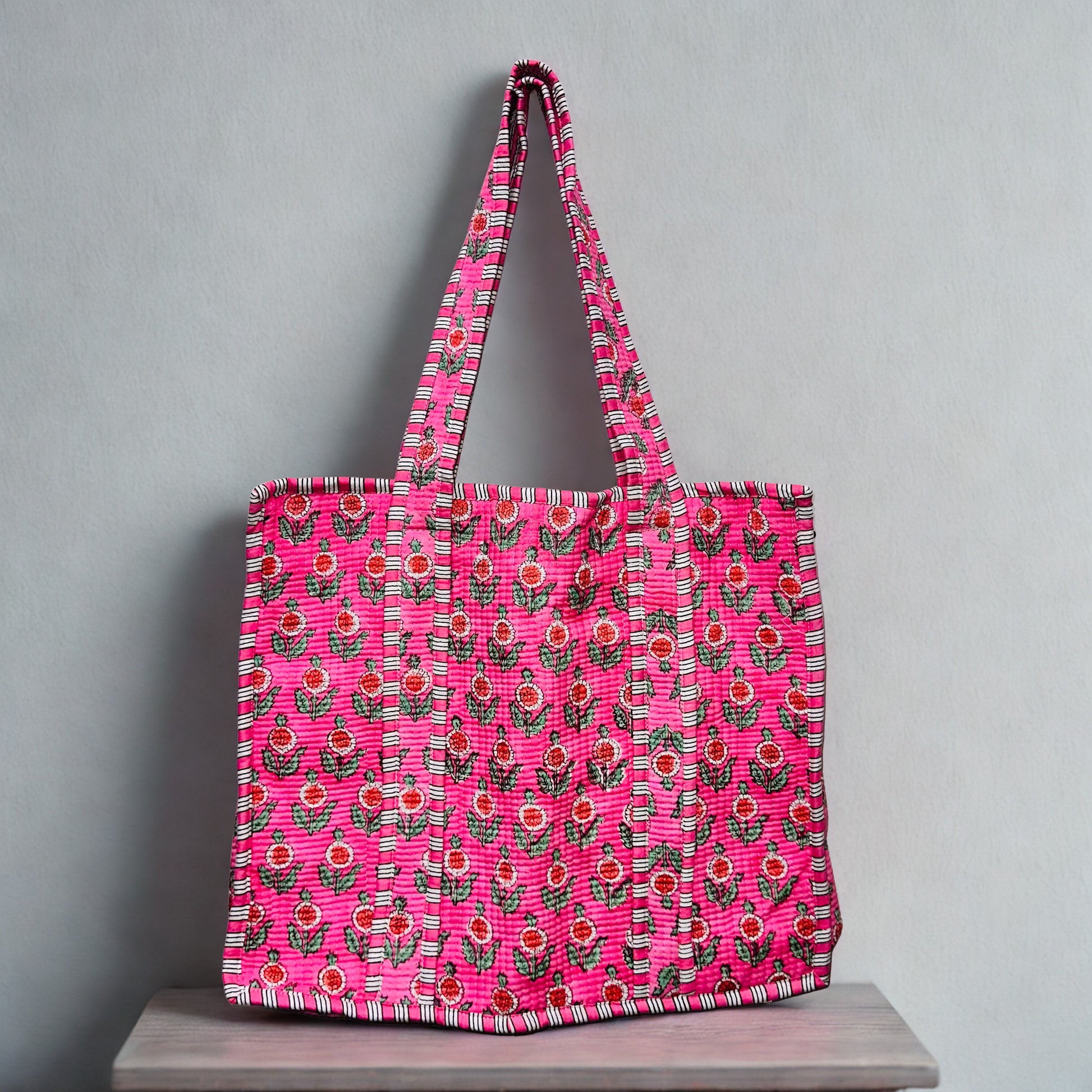 This pink pattern hand-printed tote bag combines artisanal craftsmanship with practical design. Featuring a secure zipper closure, it keeps your belongings safe while enhancing everyday convenience. The durable fabric and unique hand-printed pattern make each bag distinctive, offering both style and function for daily use. Ideal for those who appreciate quality and individuality in their accessories.