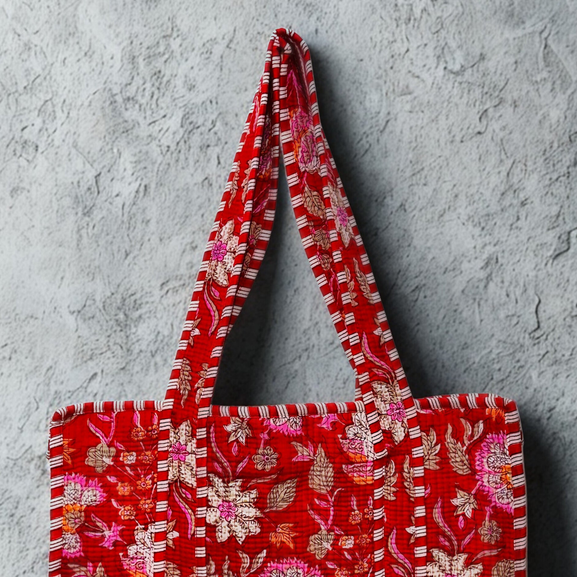 Crafted with precision, these hand-printed tote bags feature a striking red floral pattern that adds a vibrant touch to any outfit. Equipped with a secure zipper closure, they ensure your belongings remain safe while providing easy access. Durable and spacious, these totes are ideal for daily use, combining artisanal design with practical functionality. Perfectly suited for those who appreciate both style and security in their carryall.