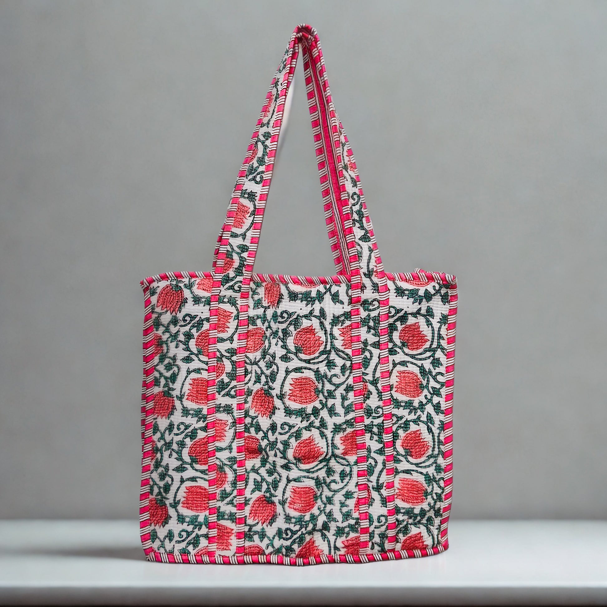 This red floral pattern tote bag combines artisanal hand-printing with practical design. Crafted with a secure zipper closure, it protects your belongings while adding a vibrant, handcrafted touch to your everyday carry. Ideal for those seeking a blend of style and functionality in a durable, eye-catching accessory.