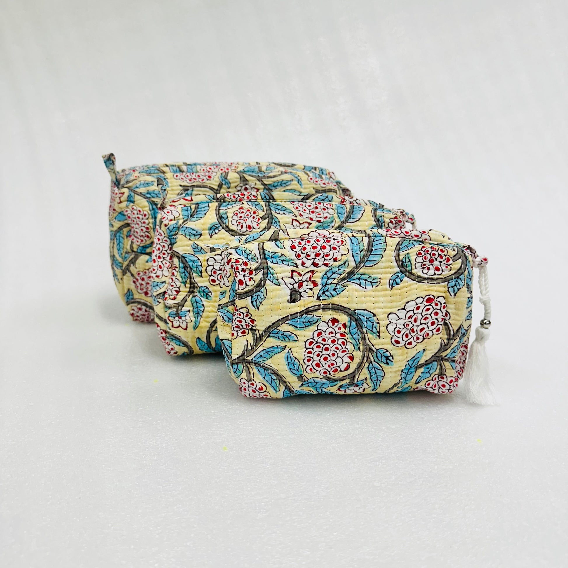 Keep your makeup and toiletries organised with this beautiful 3-piece handmade quilted travel bag set. Made from high-quality cotton, each bag is soft, padded, and designed to protect your beauty essentials. The inside has a water-resistant lining to help prevent spills and messes.