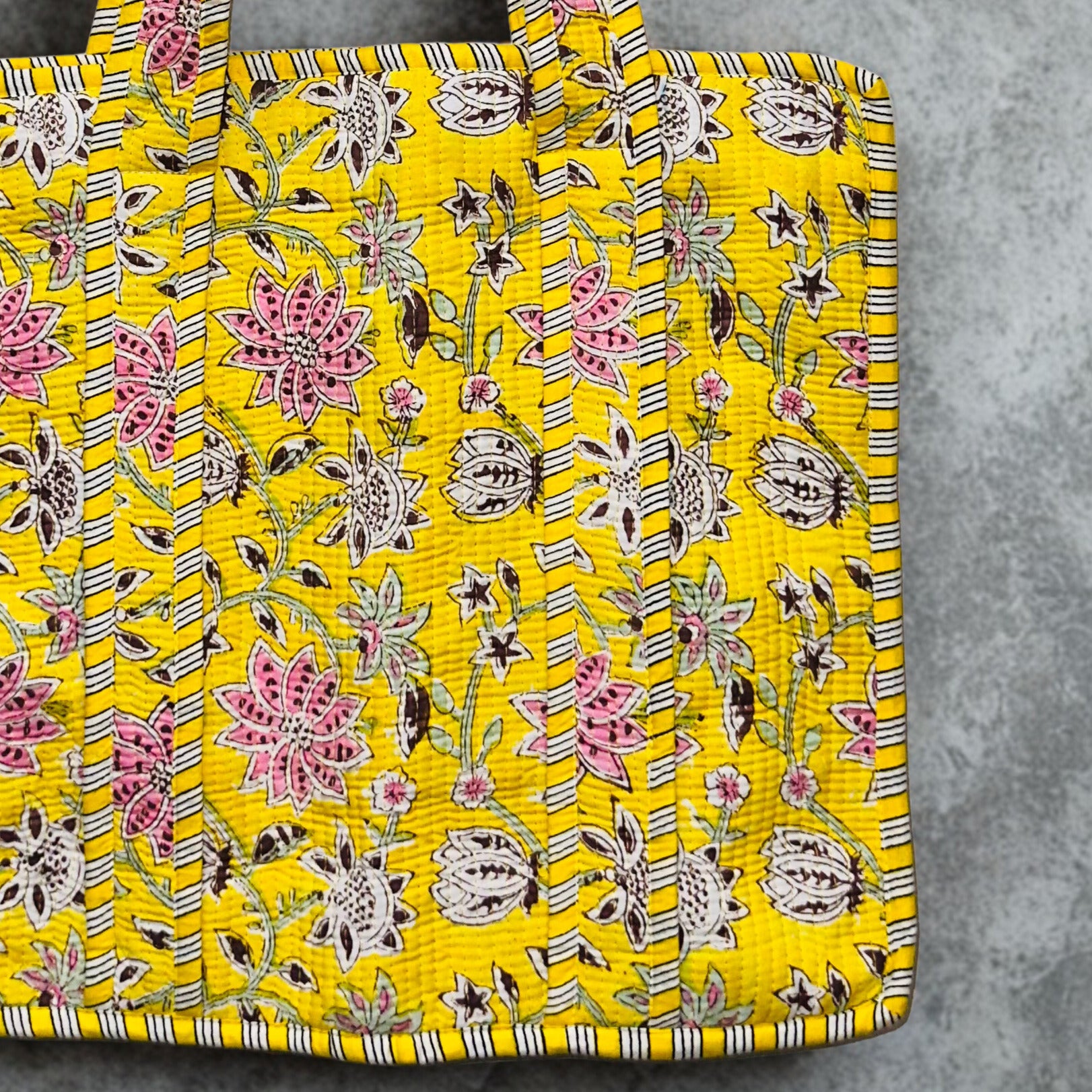 Yellow Floral Pattern Hand-Printed Tote Bag