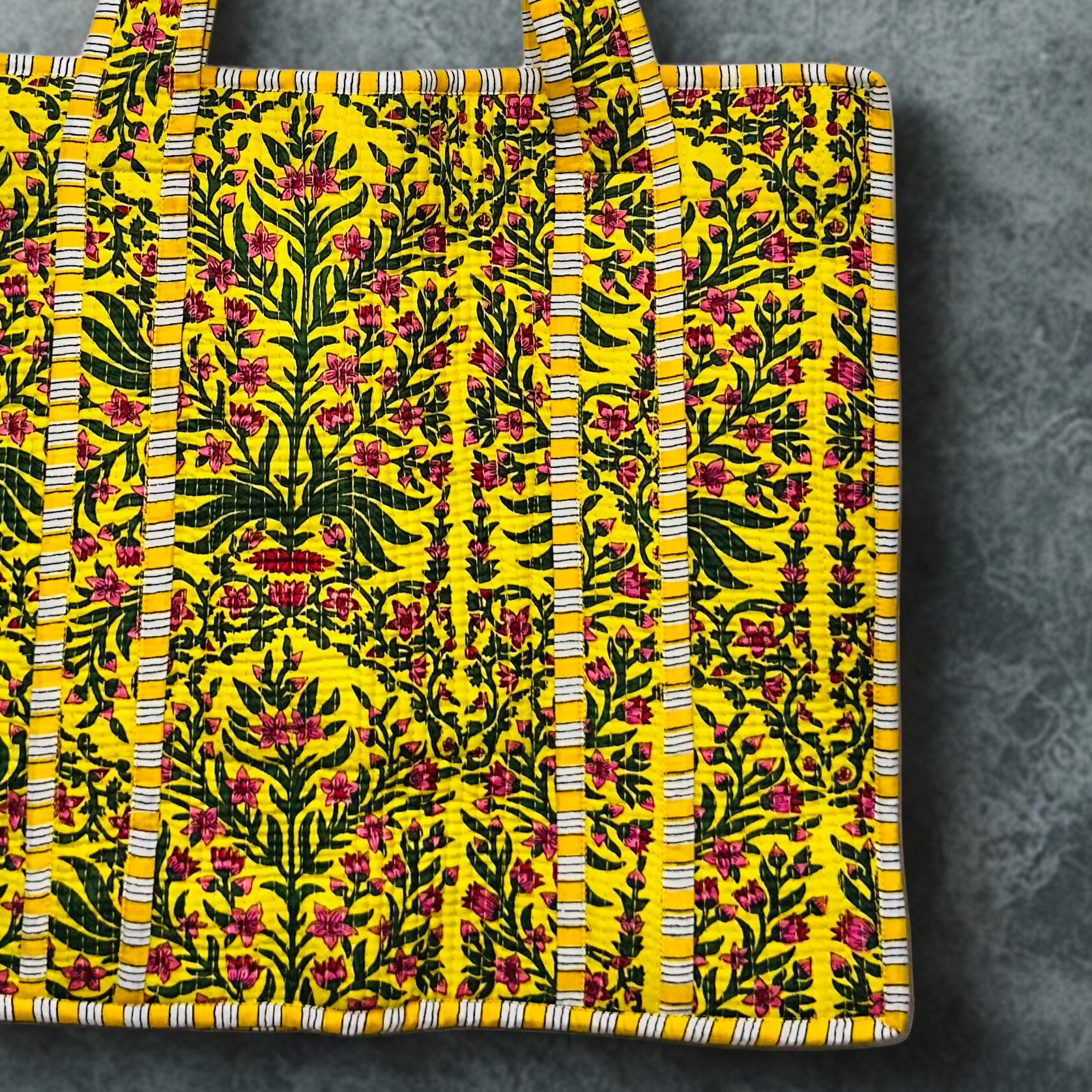 Yellow Floral Pattern Hand-Printed Tote Bag